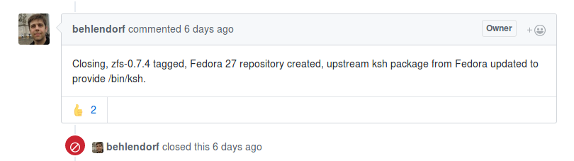My main machine at home has been upgraded from Fedora 26 to 27 since the day the 27 was released. Everything has been working great, except the ZFS file system. I’m a ZFS-believer and I store my important files on ZFS-based storage.